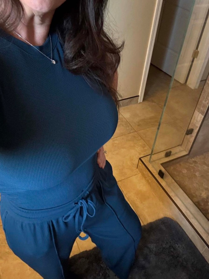 This premium 2-piece matching set features soft ribbed fabric that's comfortable enough to lounge in but polished enough to wear out. The flattering side ruching creates a fitted (not tight) silhouette, while the functional drawstring and deep pockets add that practical touch you actually need. Available in multiple colors including apricot, white, and blue. Perfect for school drop-offs, coffee runs, or literally anywhere you need to look like you have your life together. Because comfort and style shouldn't be mutually exclusive.